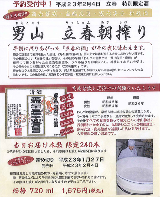 『男山 立春朝搾り(りっしゅんあさしぼり)』予約受付中!当日お届け本数 限定240本!